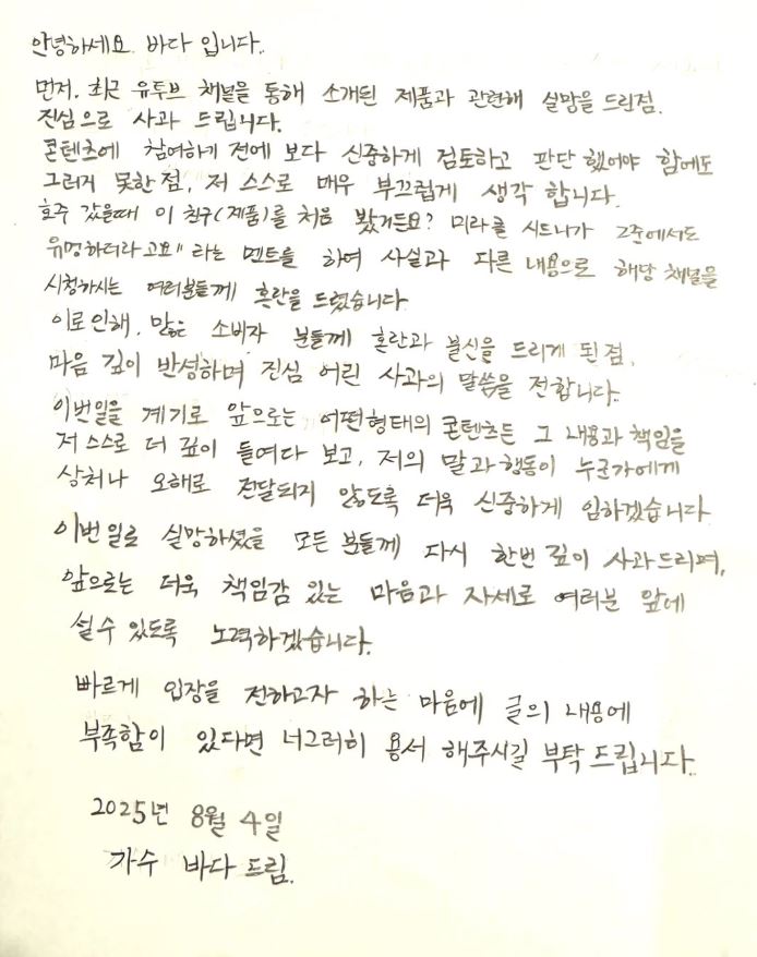 8일 인스타그램과 유튜브 채널에 사과문을 올렸다.